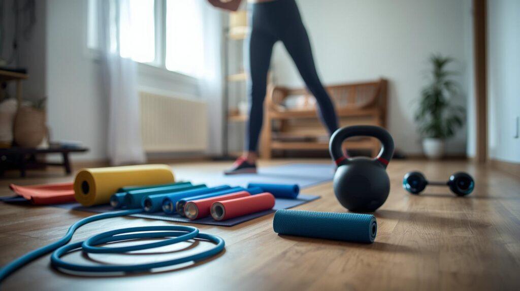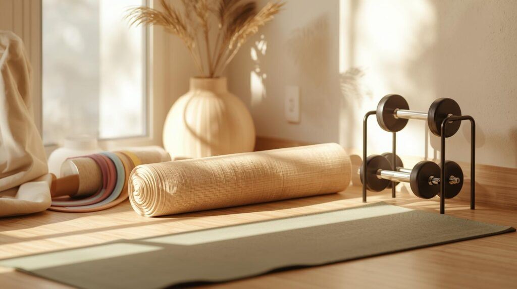 If you focus on flexibility and mobility, get a yoga mat. Adding resistance bands to your routine is also beneficial. These tools improve your flexibility and mobility workouts. By defining your fitness goals, you can tailor your home gym to your needs. This ensures you get the most out of your workouts and available space. Make sense?