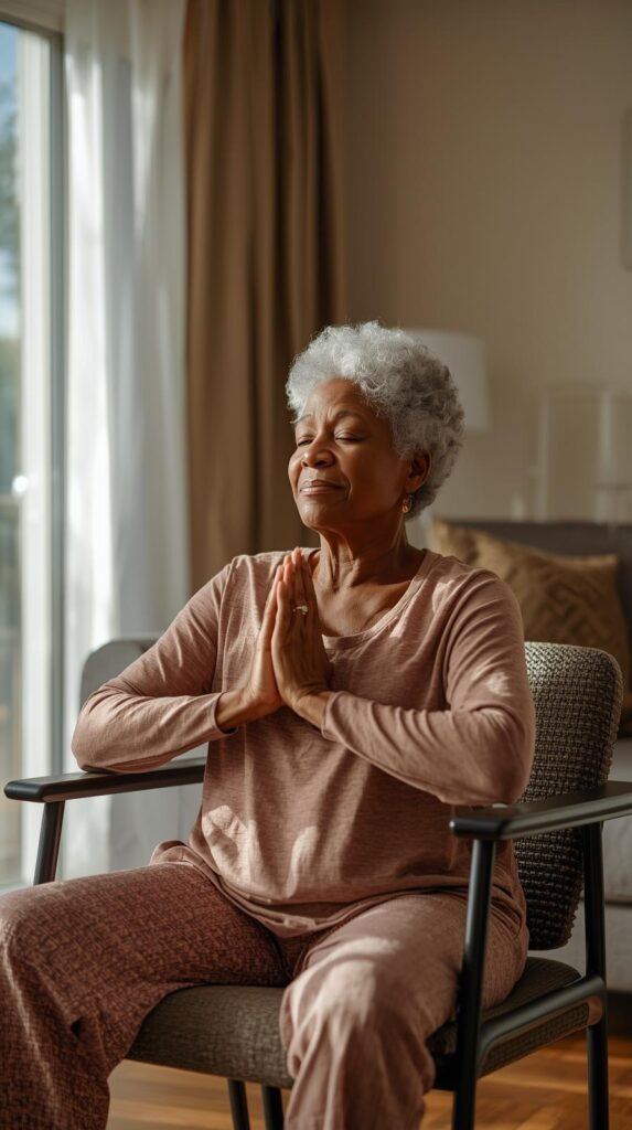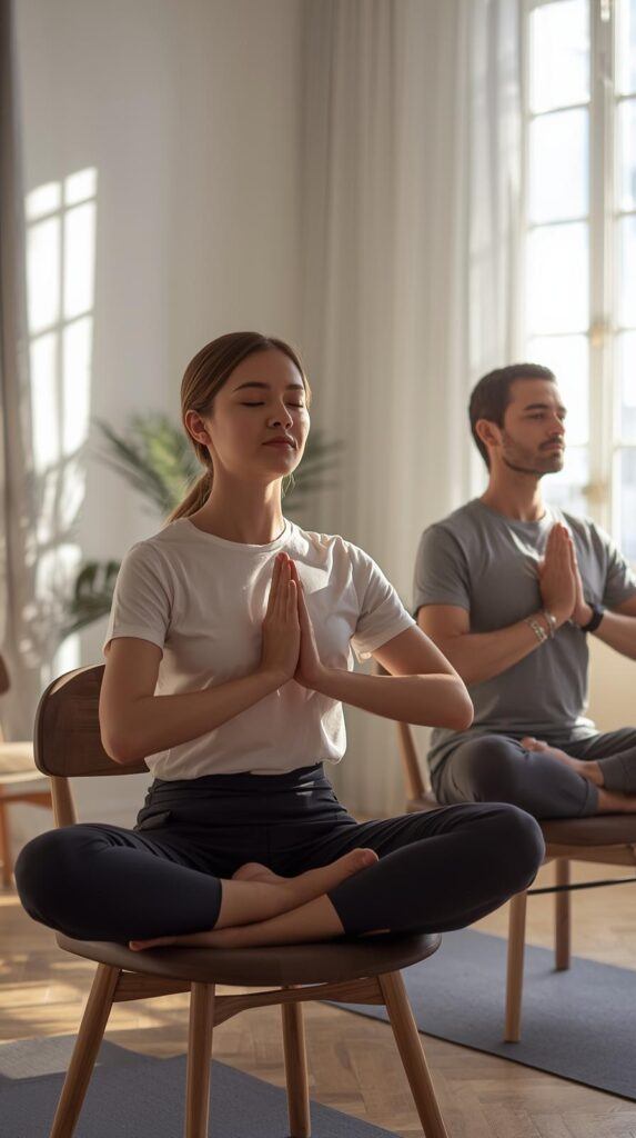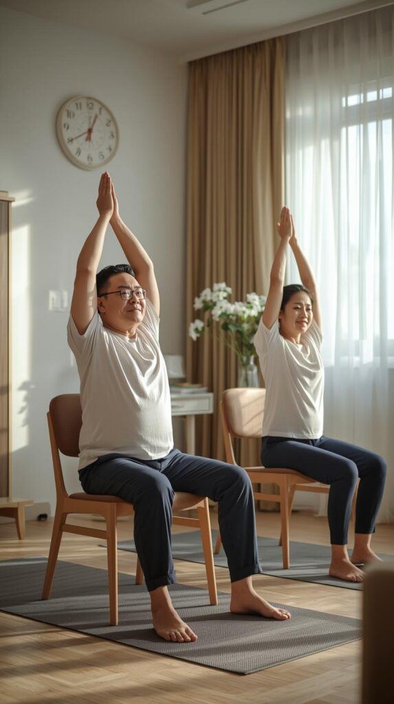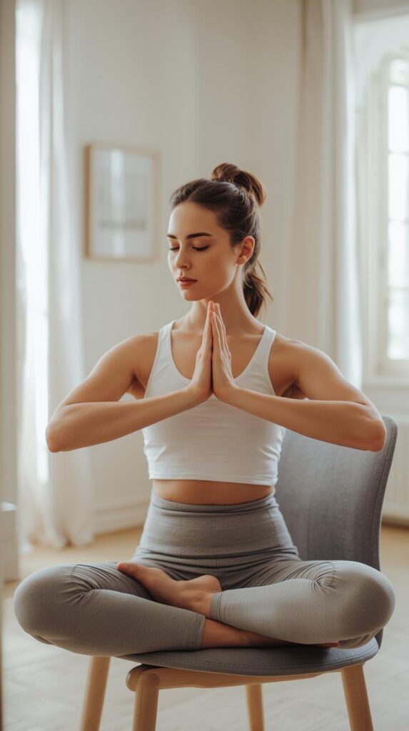 - Chair Pigeon Pose – Gently stretches the hips and reduces lower-body stiffness
